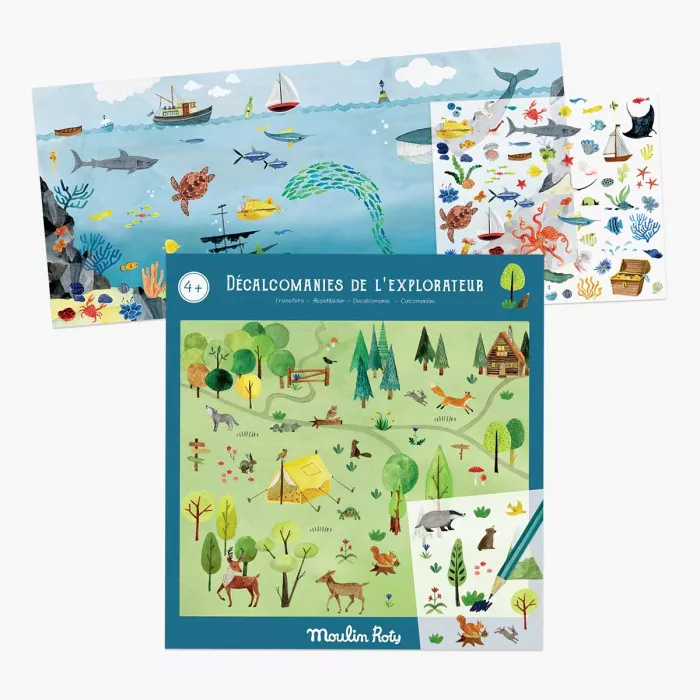 Les décalcomanies L’explorateur invitent les enfants dès 4 ans à partir à l’aventure en créant leurs propres scènes. Il suffit de placer une illustration, frotter avec un crayon et voir le dessin se transférer comme par magie sur l’un des 2 décors.