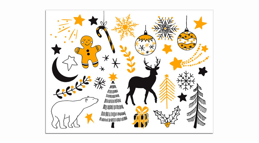 Cette planche est composée de plusieurs petits motifs comme des sapins, un ours, un cerf, un pain d’épice, des boules de noël etc…